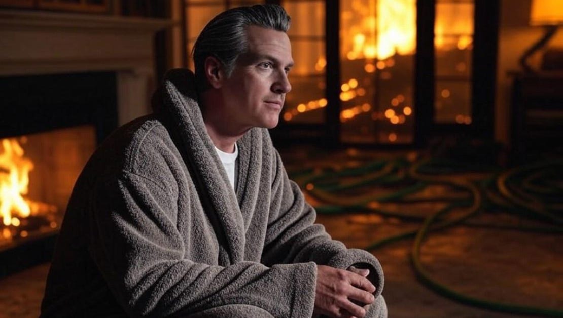 LOS ANGELES, CA — California Governor Gavin Newsom was spotted cozying up next to the flames of his own burning home, his eyes glued to a livestream of former President Donald Trump on the Joe Rogan Experience.