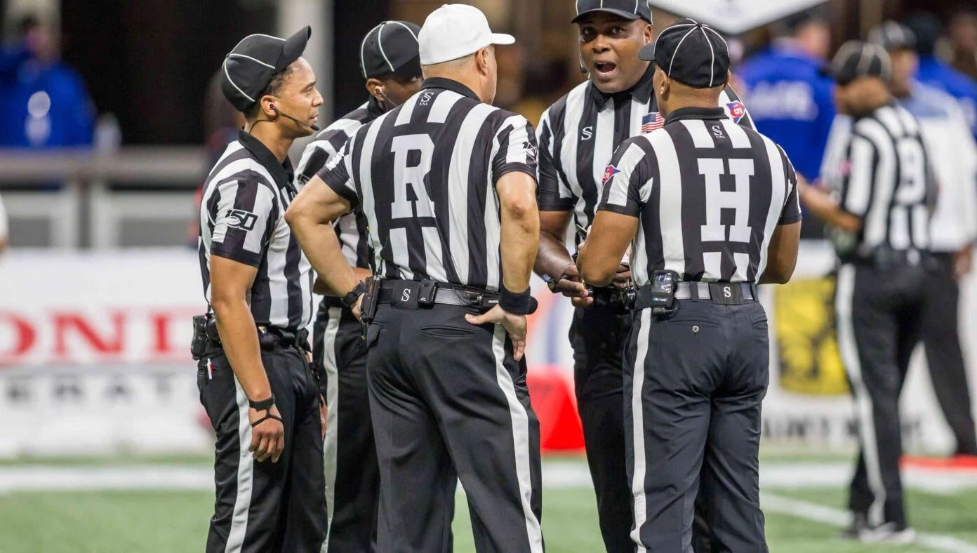 NEW ORLEANS, LA — The referees were spotted forming a huddle right in the middle of the National Anthem, seemingly engaged in a debate over which team deserved to win the big game.