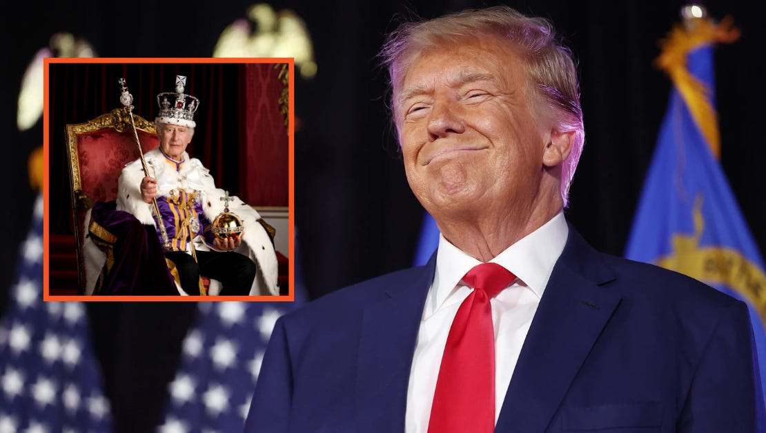 “I’ve got the best deals, folks, nobody deals better than me,” Trump boasted. “The British Empire used to be huge, tremendous, the best. But they lost it all in 1776. I’m gonna bring it back, make it great again, and all I’m asking is Canada.”