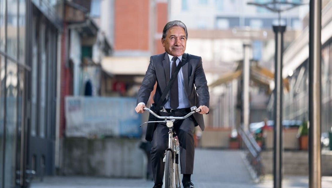 WELLINGTON, NZ — After refusing to wear a high-viz jacket during a site visit and test train ride, Winston Peters was spotted in Wellington riding a bicycle without a helmet.