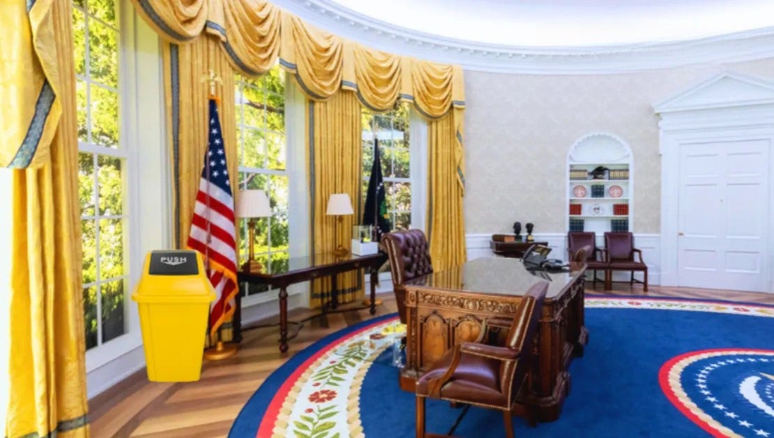 Yellow "Garbage" Bin In The Oval Office Endorses Trump For President